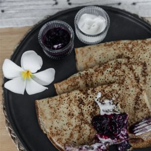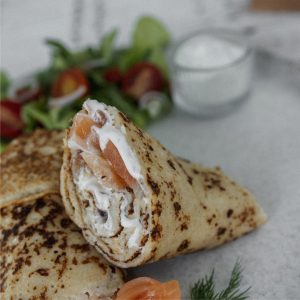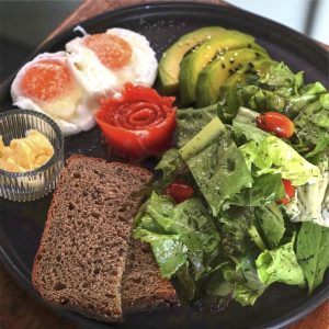 Soft Waffles made of zucchini, with salmon, poached egg. Served with homemade vegan sour cream and sliced avocado.
